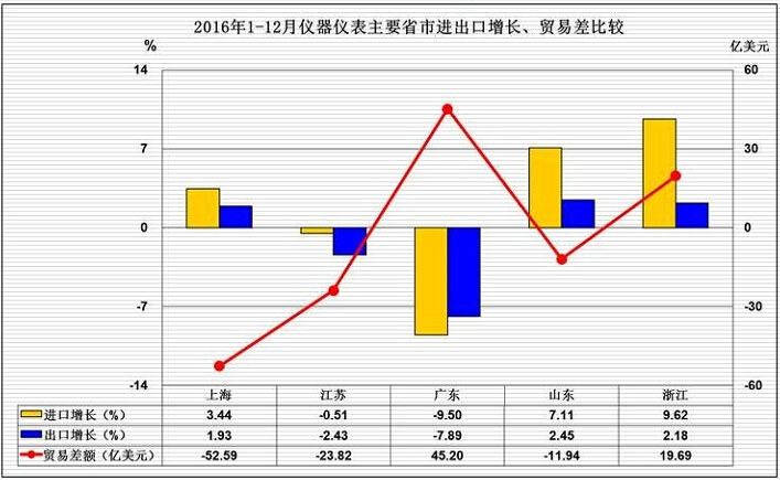 2016年1-12月份,全國31個省市儀器儀表行業進出口累計貿易逆差1045288萬美元,比上年同期增加52131萬美元,上升5.25%。全國只有廣東、浙江、河南和江西等4個省實現貿易順差,合計實現順差662923萬美元。其余27個省市合計逆差1708211萬美元。天津、河南等12個省市同比合計減少逆差132535萬美元,天津減少多(55958萬美元),其余18個省市合計增加逆差184666萬美元。